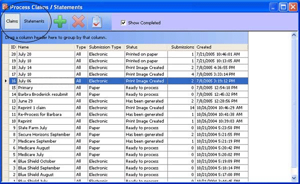 This is the main screen for adding a new batch of claims for processing. You can choose to file on paper or electronically. No other software allows you to filter claims for processing like MedOffice – you can select to batch claims by billing #, dates, type of insurance, and numerous other filters shown on the bottom tabs.
